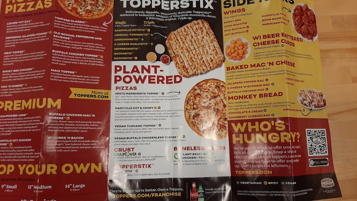 Toppers Pizza delivers a vibrant menu that caters to pizza lovers and fast-food enthusiasts alike. Located in Franklin, WI, this spot shines with its Build Your Own 'Za option, allowing you to craft the perfect pie with your choice of crust, sauce, cheese, and toppings. Noteworthy is their Pesto Margherita Topper, featuring a nut- and cheese-free pesto base topped with Wisconsin mozzarella and roasted garlic tomatoes—an excellent vegan adaptation is available using dairy-free cheese.